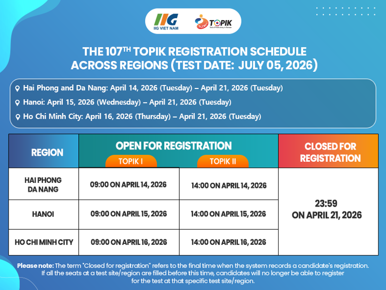 Instructions for test registration Registration Period in each region: Hai Phong, Thai Nguyen, Phu Tho and Da Nang: January 27, 2026 (Tuesday) – February 03, 2026 (Tuesday) Hanoi: January 28, 2026 (Wednesday) – February 03, 2026 (Tuesday) Ho Chi Minh City, Lam Dong Province: January 29, 2026 (Thursday) – February 03, 2026 (Tuesday)