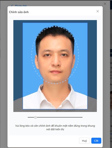 Thí sinh vui lòng tải lên ảnh thẻ hợp lệ theo đúng quy định và thực hiện căn chỉnh ảnh sao cho khuôn mặt nằm đúng trong khung nét đứt hiển thị trên hệ thống.