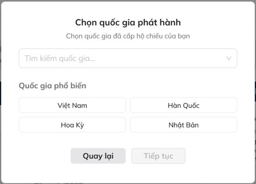 - Nếu thí sinh sử dụng Hộ chiếu để xác thực thông tin, đầu tiên thí sinh sẽ chọn quốc gia phát hành hộ chiếu.