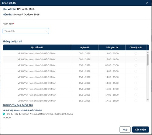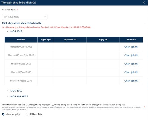 Đối với bài thi tin học: Thí sinh sẽ chọn lịch thi cho từng môn thi (có thể đăng ký nhiều môn thi cho 1 bài thi).