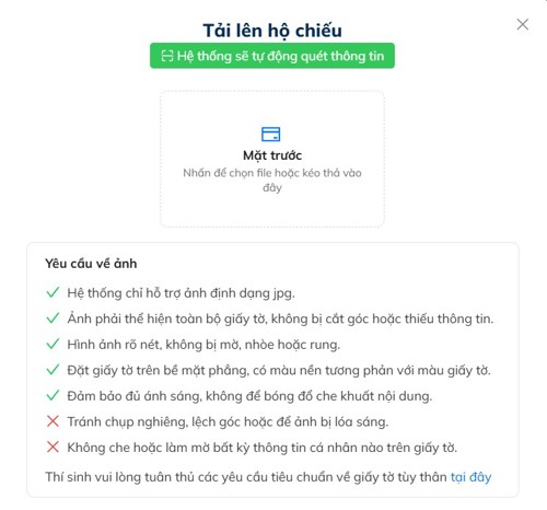Tiếp theo, thí sinh chụp hình ảnh Hộ chiếu tại trang thông tin cá nhân và tải lên hệ thống.