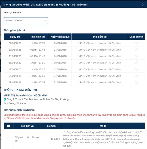 Thí sinh nhấn [Chọn lịch thi] để thực hiện lựa chọn lịch thi cho bài thi tương ứng. Tiếp theo, thí sinh lựa chọn khu vực đăng ký dự thi, hệ thống sẽ hiển thị danh sách các lịch thi để thí sinh lựa chọn và đăng ký tại khu vực đã chọn.