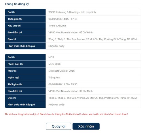 Sau khi hoàn tất thanh toán, thí sinh sẽ nhận được email thông báo từ hệ thống. Tuy nhiên, email này chưa phải là xác nhận đăng ký dự thi thành công. IIG Việt Nam sẽ tiến hành kiểm tra và phê duyệt hồ sơ đăng ký của thí sinh. Quá trình kiểm tra, phê duyệt hồ sơ và thông báo kết quả đăng ký đến thí sinh sẽ được hoàn tất muộn nhất trước ngày thi 05 ngày làm việc.