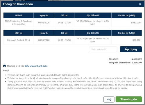 - Thí sinh cần thực hiện bước “Thanh toán ngay” trong vòng 15 phút. Trường hợp quá thời gian này, hệ thống sẽ không giữ chỗ và thí sinh sẽ phải thực hiện lại quá trình đăng ký thi từ đầu.