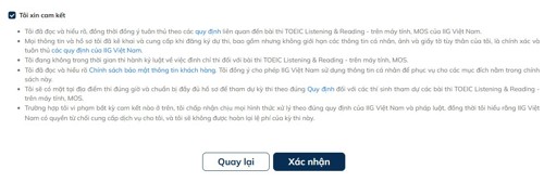 Lưu ý: Thí sinh cần đọc kỹ các nội dung và tích vào dòng chữ “Tôi xin cam kết” để đảm bảo mình đã đọc, hiểu rõ và cam kết thực hiện đúng toàn bộ các quy định, hướng dẫn của bài thi.