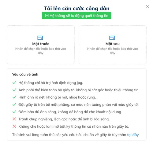 - Nếu thí sinh sử dụng Căn cước/Căn cước công dân để xác thực thông tin, thí sinh cần tải lên mặt trước và mặt sau giấy tờ tùy thân.