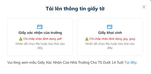 Thí sinh vui lòng đăng tải file Giấy xác nhận của trường và ảnh chụp Giấy khai sinh, sau đó điền đầy đủ thông tin cá nhân của thí sinh