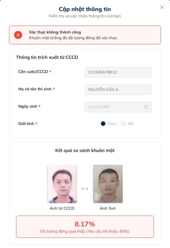 Trong trường hợp quá trình xác thực không thành công, hệ thống sẽ hiển thị thông báo nguyên nhân lỗi chi tiết để thí sinh điều chỉnh lại thông tin đăng ký.