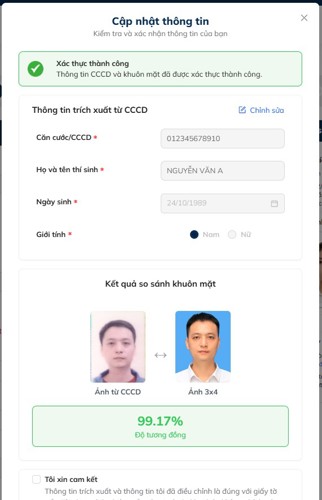 Sau khi hoàn tất quá trình đăng tải ảnh Giấy tờ tùy thân và ảnh thẻ, hệ thống sẽ trích xuất thông tin trên giấy tờ tùy thân và so khớp độ tương đồng giữa ảnh trên giấy tờ và ảnh thẻ 3x4.