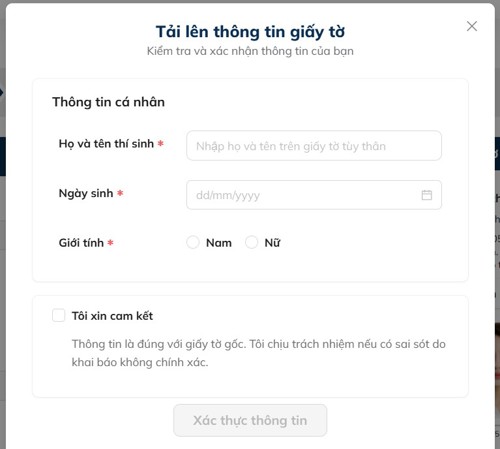 Sau khi thí sinh xác nhận các thông tin cá nhân là chính xác, thí sinh vui lòng tích chọn mục “Tôi xin cam kết” và nhấn Xác nhận thông tin. Hệ thống sẽ tự động điền các thông tin đã được xác minh vào mục Đăng ký thi.
