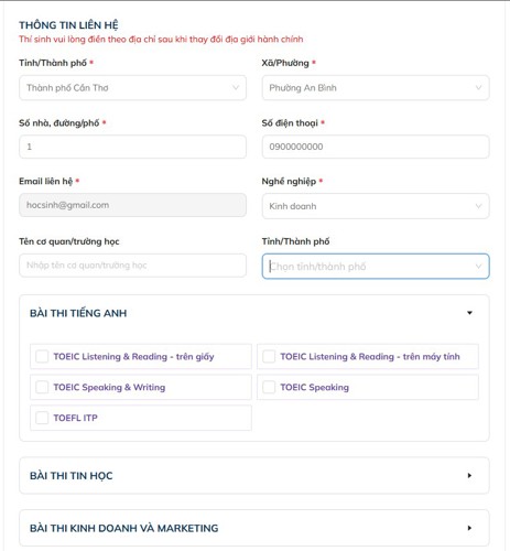 Thí sinh nhập thông tin liên hệ và chọn bài thi cần đăng ký thi. Có thể chọn nhiều bài thi trong cùng 1 lần đăng ký.
