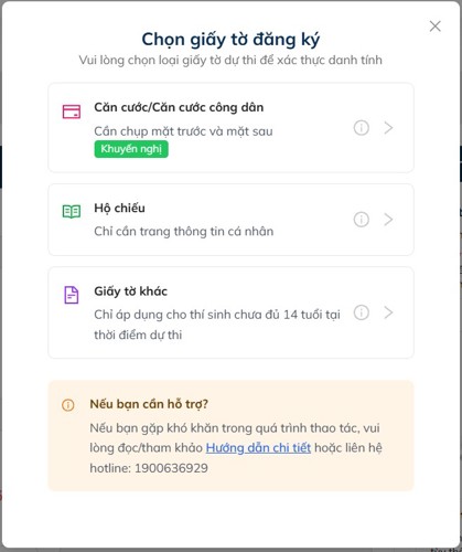 Đối với tài khoản mới chưa được xác thực thông tin, hệ thống sẽ hiển thị popup yêu cầu thí sinh chọn loại giấy tờ đăng ký thi