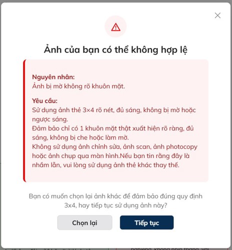 Hệ thống sẽ tự động kiểm tra ảnh thẻ nhằm xác định mức độ phù hợp với các yêu cầu của quy định. Trong trường hợp ảnh thẻ chưa đáp ứng quy định, hệ thống sẽ hiển thị pop up cảnh báo lỗi tương ứng.
