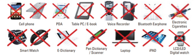 Tất cả các thiết bị có thể liên lạc, ghi âm, quay phim, nghe nhạc (như điện thoại di động, máy tính bảng, tai nghe, v.v.); các vật dụng có chức năng thanh toán, kết nối (Bluetooth, v.v.) hoặc vật dụng có màn hình điện tử (LCD, LED), như từ điển điện tử, đồng hồ điện tử, v.v.); cũng như các thiết bị có thể sạc được khác (thuốc lá điện tử, pin sạc dự phòng, v.v.), đồ ăn, ... đều bị cấm mang vào phòng thi. Nếu thí sinh đã mang những thiết bị bị cấm vào phòng thi thì phải tắt âm, tắt nguồn toàn bộ và các chế độ báo thức, sau đó nộp lại cho giám thị trước giờ thi. Trong giờ thi, nếu giám thị phát hiện ra trong cặp của thí sinh có những vật dụng bị cấm hoặc các thiết bị điện tử đã nộp phát ra âm thanh hoặc tiếng ồn thì thí sinh sẽ bị xử lý theo quy định phòng thi.